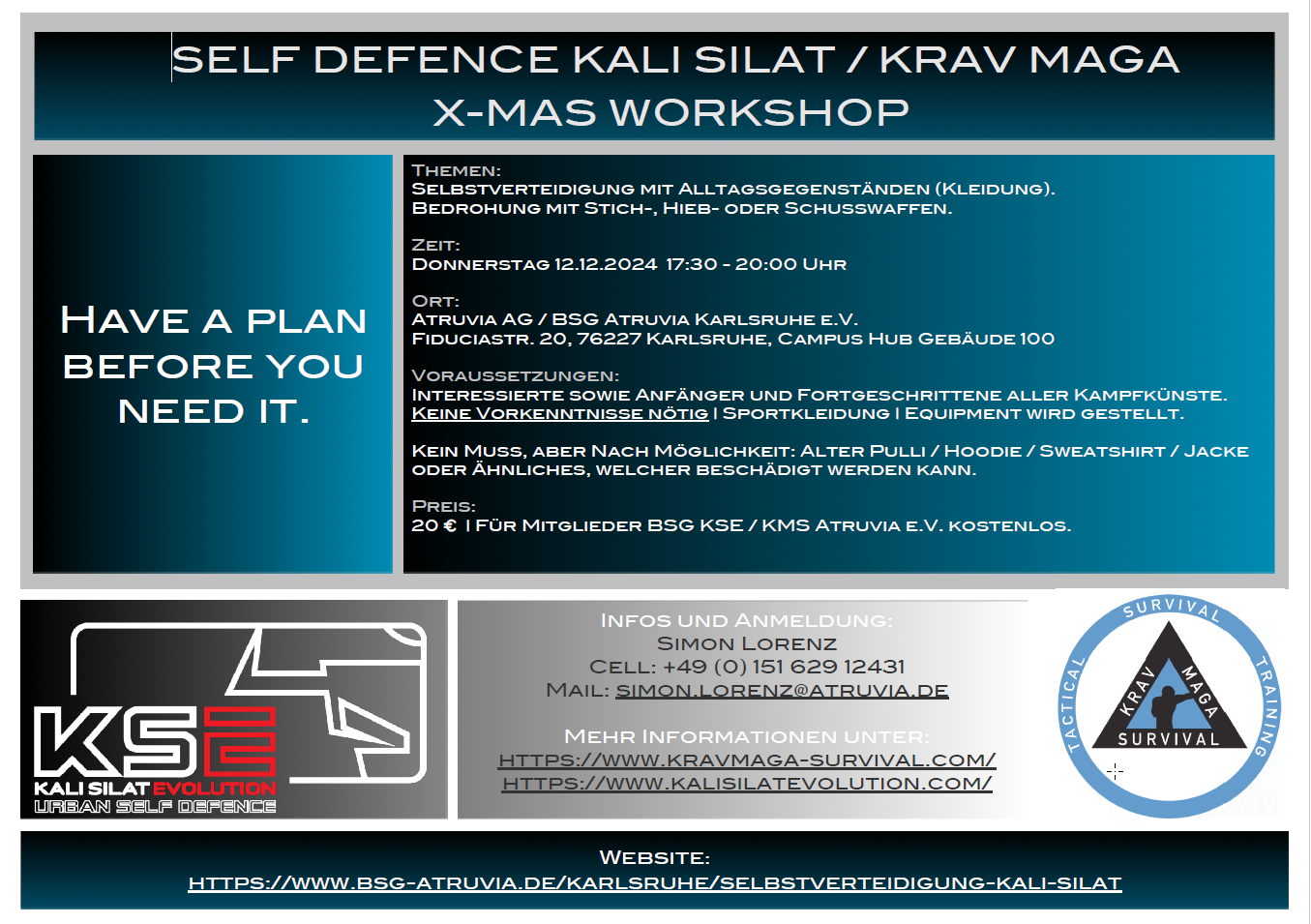 findet ein Workshop (alljährliches X-Mas Special) - Kali Silat Urban Self Defence / Krav Maga Survival statt.